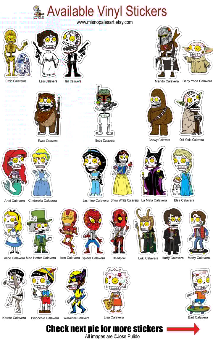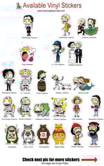 Choose any (3), (5), or (10) high quality vinyl stickers from the selections shown in the above photos. Be sure to check out all 5 photos to view entire sticker catalog.