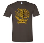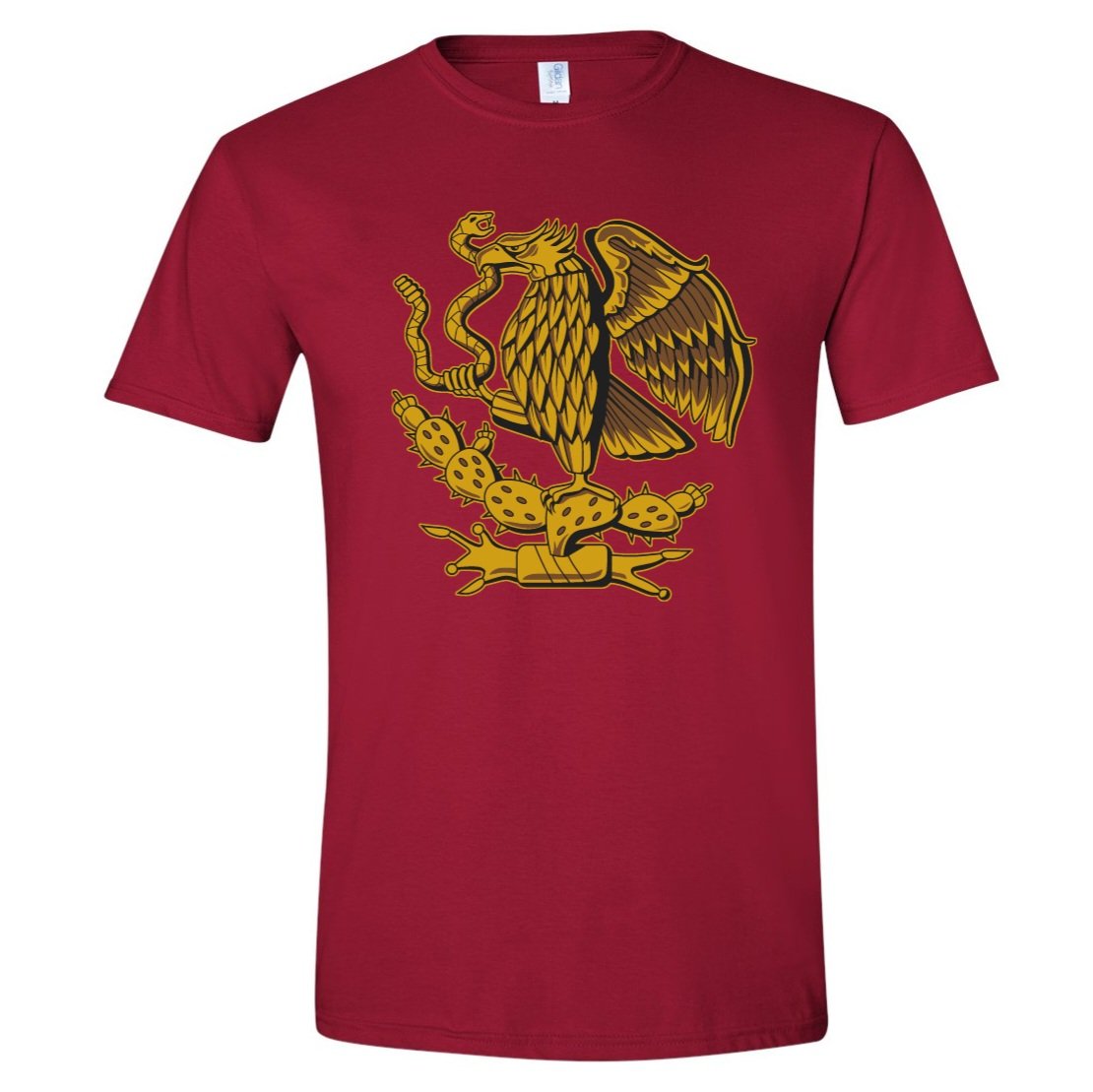 3 color screenprint on a BLACK, CARDINAL RED, or DARK BROWN Men's/Unisex 100% cotton Gildan softstyle T-Shirt. This is a soft comfortable lightweight T-Shirt that runs fitted so sizes run a bit smaller than an average T-Shirt.