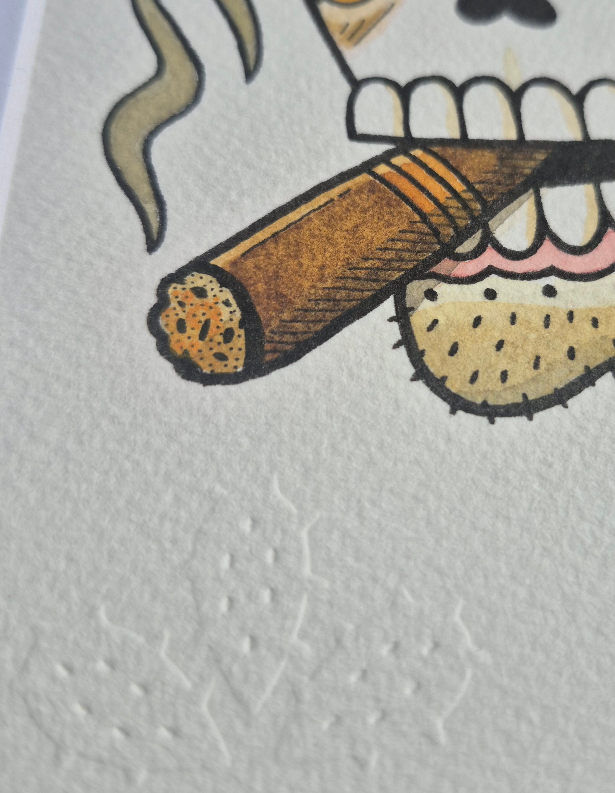 This is an ink and watercolor illustration done on a 5" x 7" sheet of Arches paper. Signed by the artist and embossed with Mis Nopales logo.