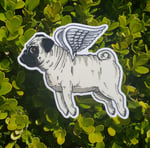 This is a high quality weather-proof vinyl sticker of my Flying Pug image. The sticker is die-cut and measures about 3" x 2.5". This sticker has a white background.